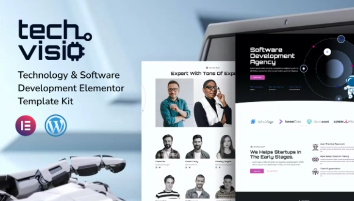 Desarrollado por Dever Ust y disponible en ThemeForest ($22), Techvisio es un kit de plantillas Elementor de nicho diseñado para empresas de tecnología, desarrollo de software y consultoría de TI. Combina una estética moderna con herramientas funcionales para ayudar a las marcas tecnológicas a crear sitios web profesionales sin codificación. Compatible con WordPress 6.x y Elementor 3.10.0+, es una opción popular para agencias y autónomos que crean sitios para clientes, aunque requiere Elementor Pro para acceder a todas las funciones.