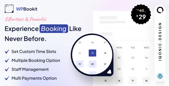 Mejore la programación de sus citas con WPBookit Plugin para reservar citas. Al ofrecer una experiencia de reserva profesional y fácil de usar, atraes a más clientes y haces crecer tu negocio. Instale el plugin ahora y simplifique la programación en su sitio de WordPress.