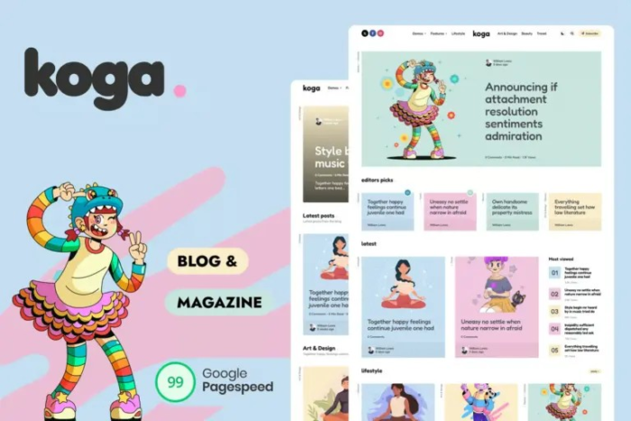 Koga integrates seamlessly with popular page builders like Elementor, allowing drag-and-drop editing without any coding. It's optimized for speed and SEO, helping your posts rank higher and load faster. Enjoy features like featured sliders, category grids, author boxes, and social sharing for a complete blogging experience.